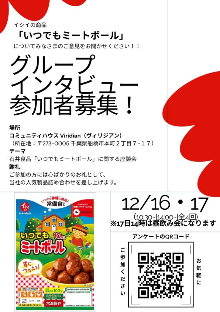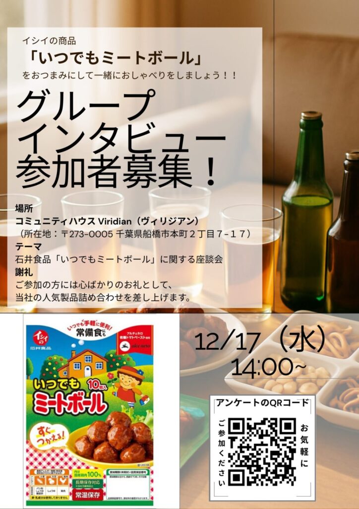 イシイの「いつでもミートボール」について、皆様の率直なご意見をお聞かせいただきたくグループインタビュー参加者を募集します😍