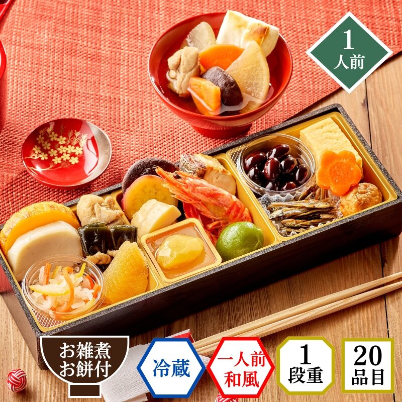 ミニおせちながら、お雑煮も付いて20品目入った華やかなおせち。これ一つでお正月料理はばっちりです。