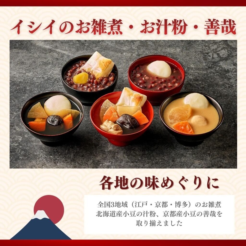京都亀岡産の小豆を使ったシンプルな善哉と、北海道産小豆にアクセントで栗が入った汁粉、そしてそれぞれに味付けや具材の異なる3種類のお雑煮を、まとめてセットにしました。