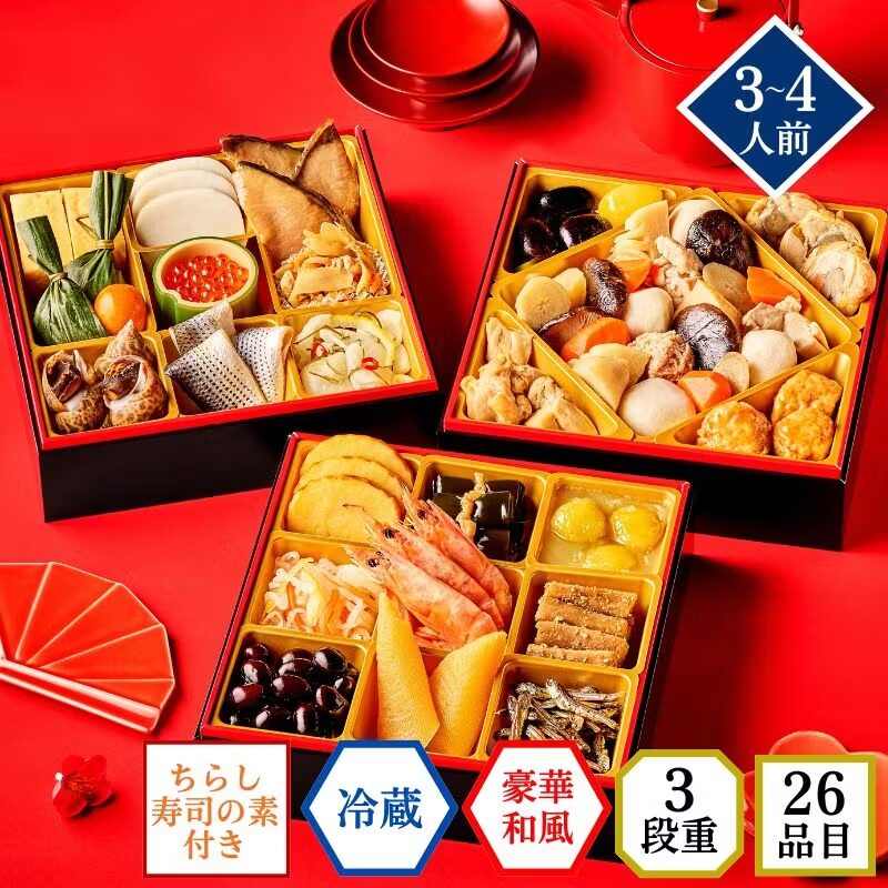 素材のおいしさを追求した、本格的な味わいの和風おせち。3~4人でも満足できるボリューム満点の3段重です。