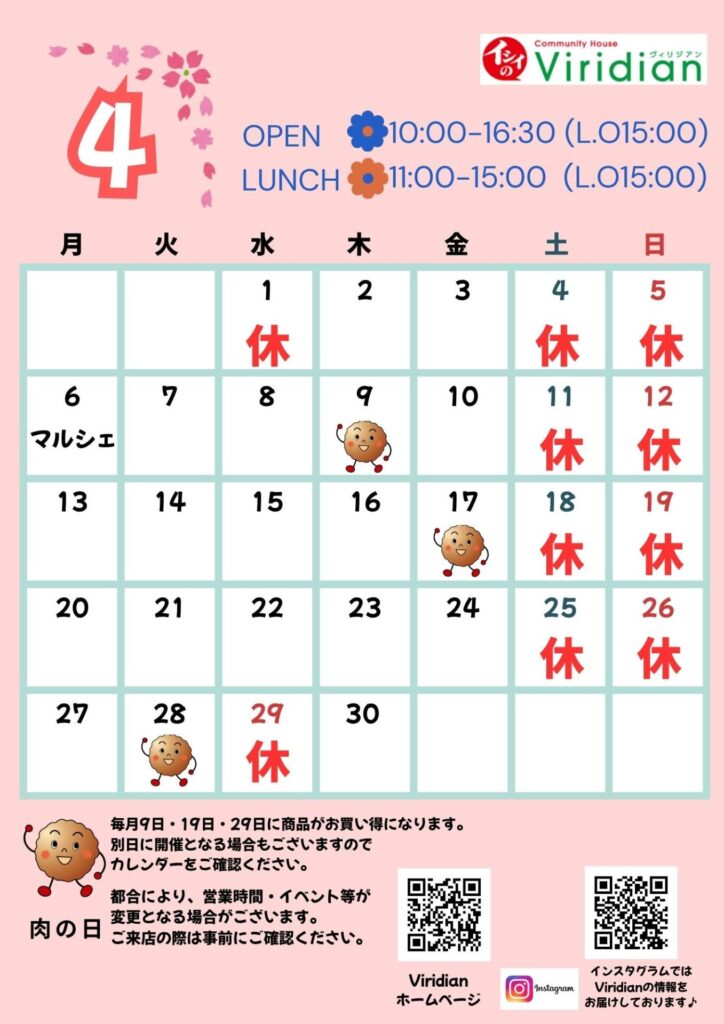 2026年3月25日【営業時間のご案内】2026年4月休館日営業時間 SNSでシェアする 𝕏 ポスト share LINE 【営業時間のご案内】2026年4月 2026.03.25 【店舗情報】Viridian共同企画レン... 2026.03.07 【イベント情報】Viridianマルシェ 2026.02.26 【営業時間のご案内】2026年3月 2026.02.26 【イベント開催報告】「いつでもミートボー... 2026.02.24 【イベント情報】「いつでもミートボール」... 2026.02.12 【商品情報】本日限定 ピザランチメニュー... 2026.02.09 【商品情報】イシイのパッケージシール&ミ... 2026.02.06 【店舗情報】お祝い応援キャンペーンのお知... 2026.02.03 【イベント開催報告】船橋市役所様、湊町地... 2026.02.03